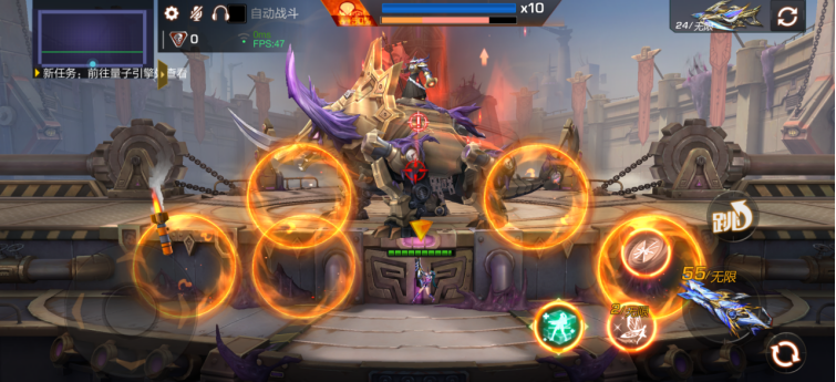 BOSS发射信号信标,场景中出现8枚信标,8枚信标连成激光连线,并不断向场中移动,且每上下两组信标会同时周期性向外发射一枚能量子弹。玩家可以选择躲避在激光连线中间,则需要跟着激光连线左右移动;也可选择躲在激光连线外,则需要上下躲避能量子弹。