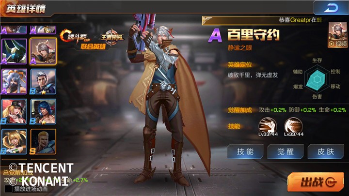 百里守约的定位是狙击手,拥有超强的暴击伤害。他的第一技能【狂风之息】威力惊人,指挥官长按技能键,就可以进行超远距离的瞄准射击。这样一来既躲开了对手的攻势,又能对其造成巨额伤害。哪怕是对手选用了S级英雄出战,也无法逃脱百里守约的狙击!而百里守约的另一技能【逃脱】,更是让百里进入隐身状态且向后退一段距离。逃脱不是懦弱,只是为了在一个更加有利的地方,向敌人再次进攻!